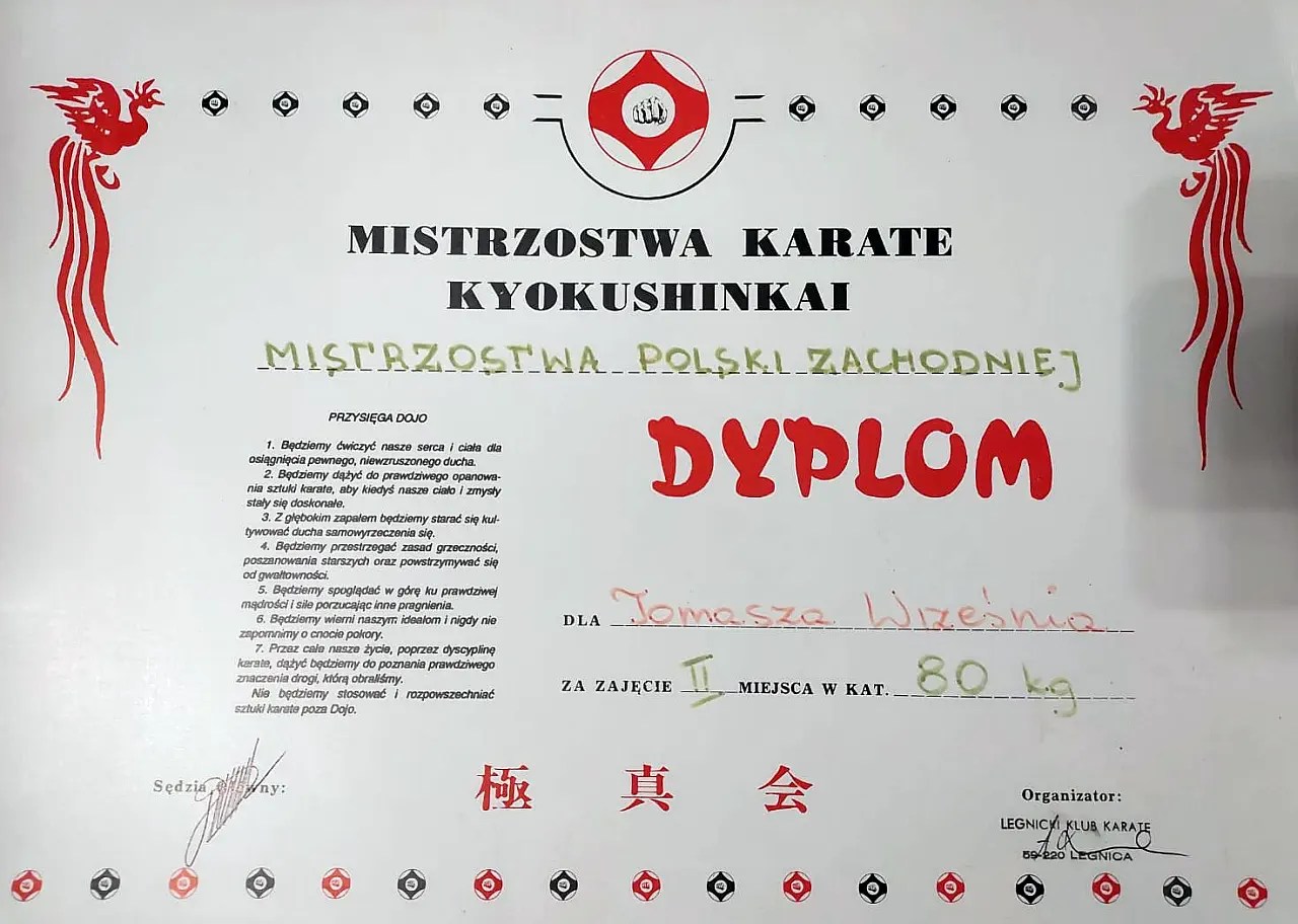 Toruński Klub Karate Kyokushin reprezentowało dwóch zawodników. Dariuszowi Łukiewskiemu w kategorii -75kg nie udało się przejść rundy eliminacyjnej. Natomiast Tomasz Wrzesień w kategorii -80kg wywalczył II miejsce – gratulacje!