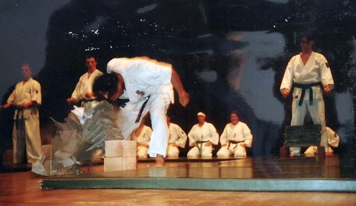 W pokazie zaprezentowane zostały kombinacje technik, kata również przez gościa, który wykonywał kata Tensho. Na zakończenie naszych pokazów razem z sensei Miyazaki rozbijaliśmy dachówki w teście temashiwarii. Miyazaki rozbił głową 15 dachówek!
