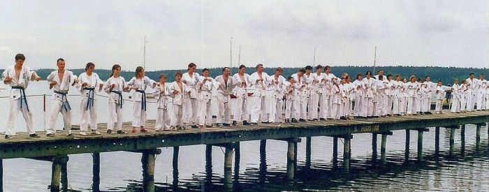 W weekend 17-19.05.1996 już po raz szósty wybraliśmy się na Zgrupowanie do Pieczysk k/Koronowa. Ty razem padł rekord – w wyjeździe uczestniczyło 80 osób. Na miejsce przyjechaliśmy dwoma autokarami. Było to duże wyzwanie organizacyjne, ale udało nam się spędzić dobrze ten czas na treningach karate, które odbywały się jak zwykle tam gdzie się dało 🙂 – plaża, pomost, ścieżki leśne. Wyjazd ten można by nazwać rozbiegówką przed czekającymi nas obozami letnimi. Pogoda nam dopisała do tego stopnia, że niektóre osoby podjęły próbę opalania się 🙂