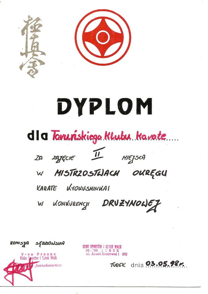 W niedzielę 03.05.1998 w Turku odbyły się Otwarte Mistrzostwa Okręgowego Związku Karate. Turniej odbył się w jednej konkurencji kata z podziałem na wiek. Skorzystaliśmy z zaproszenia organizatora i 9 zawodników wzięło udział w tej rywalizacji. Czterech torunian stanęło na podium…