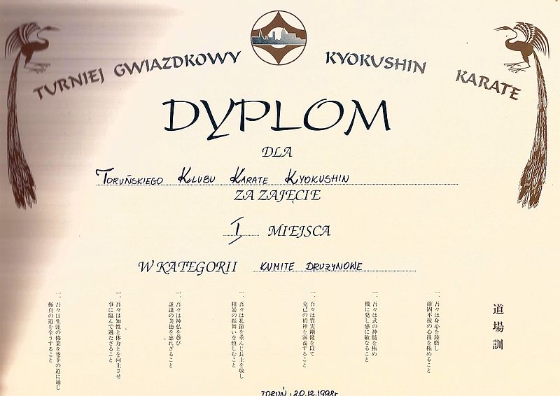 W dniu 20.12.1998 zorganizowaliśmy VIII Turniej Gwiazdkowy. W Turnieju wzięło udział 256 zawodników z kilkunastu klubów. Nasz klub reprezentowali zawodnicy ćwiczący w sekcjach w Toruniu i Ciechocinku. Zawody rozegrano w hali sportowej X LO przy Pl. Św. Katarzyny 9. Duża ilość zawodników i kibiców było olbrzymim wyzwaniem organizacyjnym. Turniej rozegrano w trzech konkurencjach: kata indywidualne, wali reżyserowane i kumite juniorów. Serdecznie dziękujemy wszystkim członkom klubu za duże zaangażowanie w przygotowanie i przeprowadzenie zawodów – OSU! Wyniki turnieju..