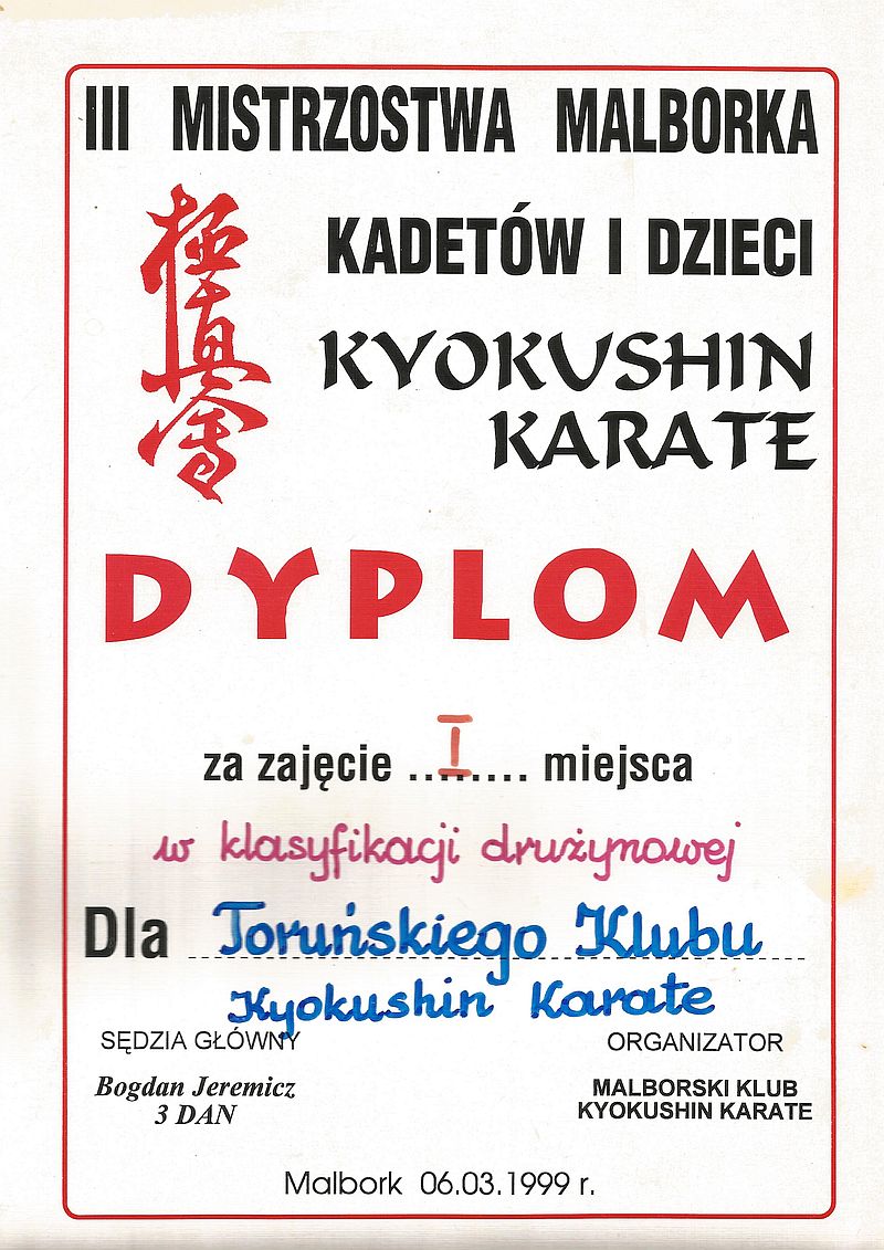W dniu 06.03.1999 w Malborku po raz trzeci rozegrano Mistrzostwa Malborka Kadetów i Dzieci w kata. Nasza drużyna składała się z 28 zawodników trenujących w sekcjach klubu. Dziewięciu zawodników stanęło na podium turnieju co w podsumowaniu drużynowym dało naszemu klubowi tytuł Mistrza Malborka w kata…