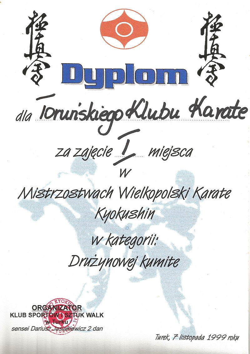 W dniu 07.11.1999 w Turku odbyły się Otwarte Mistrzostwa Wielkopolski. Zawody odbyły się w dwóch konkurencjach: kata juniorów i kumite. Nasz klub reprezentował liczna ekipa składająca się aż z 34 zawodników ćwiczących w Toruniu oraz w sekcji w Ciechocinku. W podsumowaniu drużynowym zdobyliśmy I miejsce oraz Puchar Wielkopolski. Wyniki torunian…
