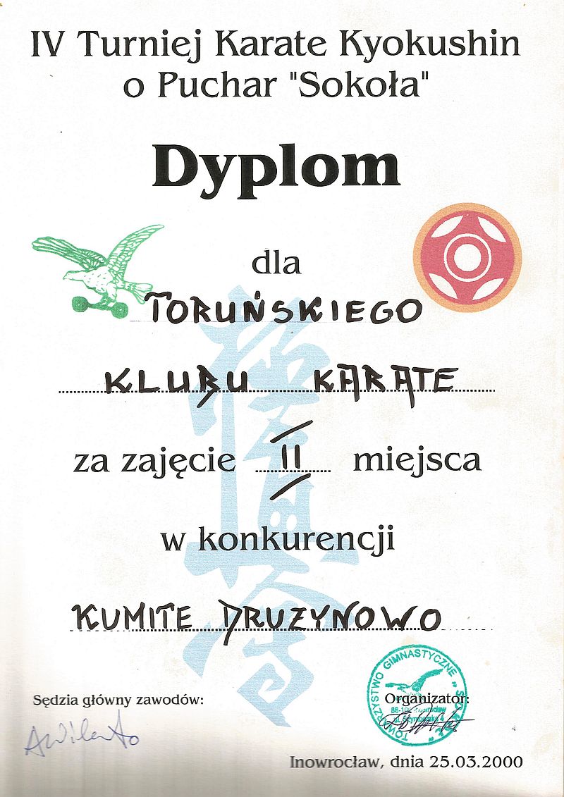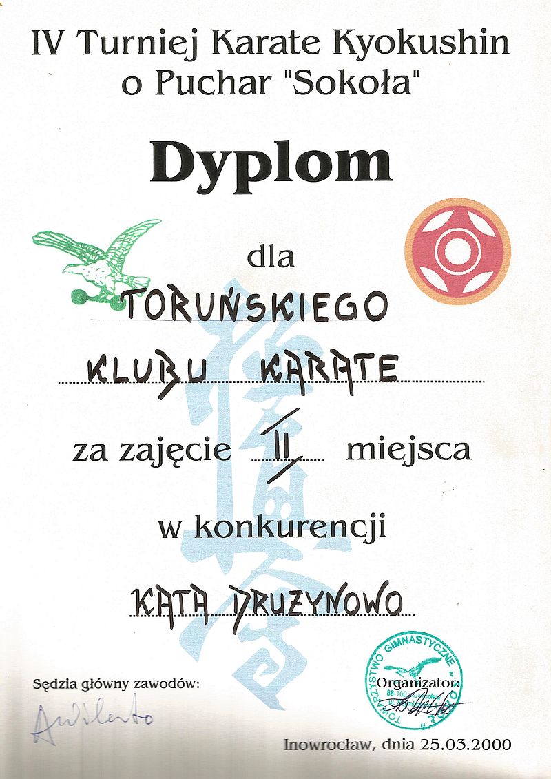 W dniu 25.03.2000 –odbył się już IV Turniej o Puchar „Sokoła” w Inowrocławiu. W zawodach uczestnicy rywalizowali w konkurencjach kata juniorów i kumite i walkach reżyserowanych. Nasza drużyna składała się z 20 zawodników głównie startujących w kata. Sześcioro z nich zdobyło miejsca medalowe…
