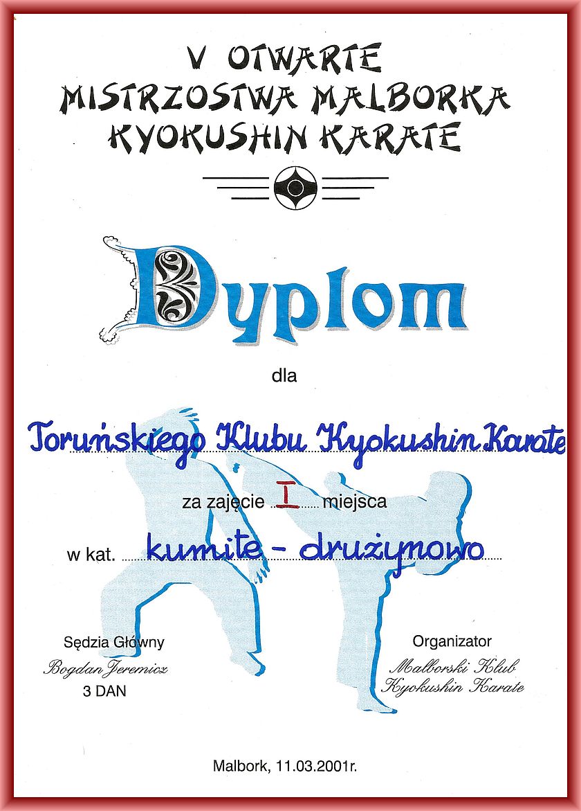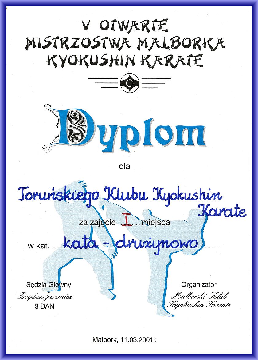 11.03.2001 odbyły się V Otwarte Mistrzostwa Malborka. Turniej zorganizował Malborski Klub Kyokushin Karate kierowany przez sensei Wojciecha Kunickiego. Tym razem zawody odbyły się zarówno w konkurencji kata dla juniorów jak i kumite dla pełnoletnich zawodników. Nasza drużyna pojechała w licznym składzie aż 25 zawodników. Świetna postawa zarówno startujących w kata jak i kumite dała nam podwójny tytuł najlepszej drużyny turnieju.