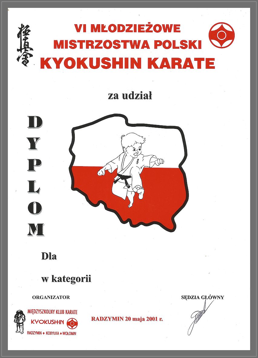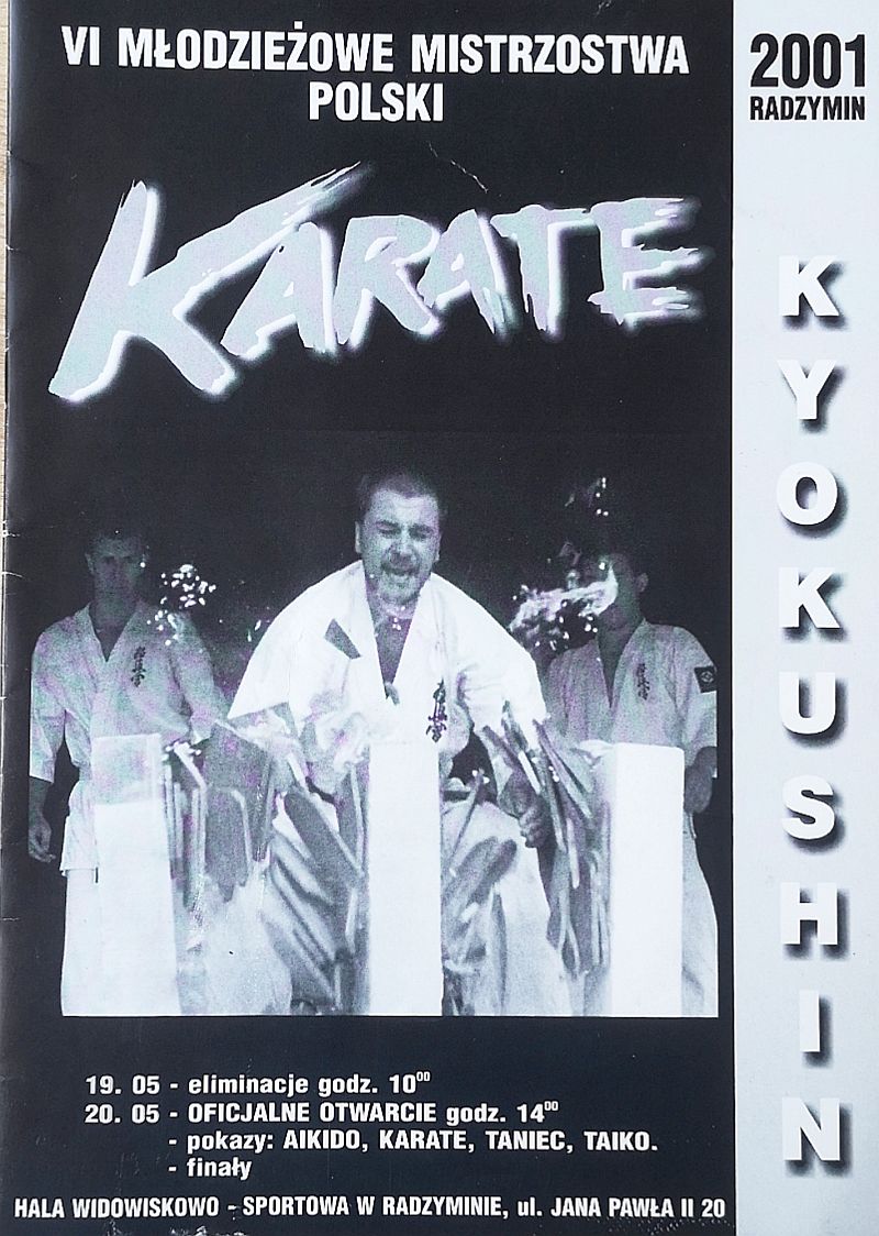 19-20.05.2001 w Radzyminie odbyły się VI Mistrzostwa Polski Młodzików i Kadetów. Turniej zorganizował Międzyszkolny Klub Karate Kyokushin kierowany przez sensei Tomasza Lenkiewicza. Mistrzostwa rozegrano w konkurencjach kata, walk reżyserowanych i clicker. Z naszego klubu w zawodach wzięła udział trójka młodych zawodników. Choć nie przywieźli żadnego medalu to i tak było to dla nich ciekawe doświadczenie startowe. Clicker jako formuła walki bezkontaktowej nie dość precyzyjnie określa zwycięzcę pojedynku. Było dużo niejasności i sprzeczności w werdyktach. Robiło to raczej wrażenie show niż turnieju karate. Nie mniej wszyscy mamy nadzieję, że formuła turniejów dla juniorów rozwinie się we właściwą stronę jaką jest kyokushin karate. Rezultaty naszych zawodników:…