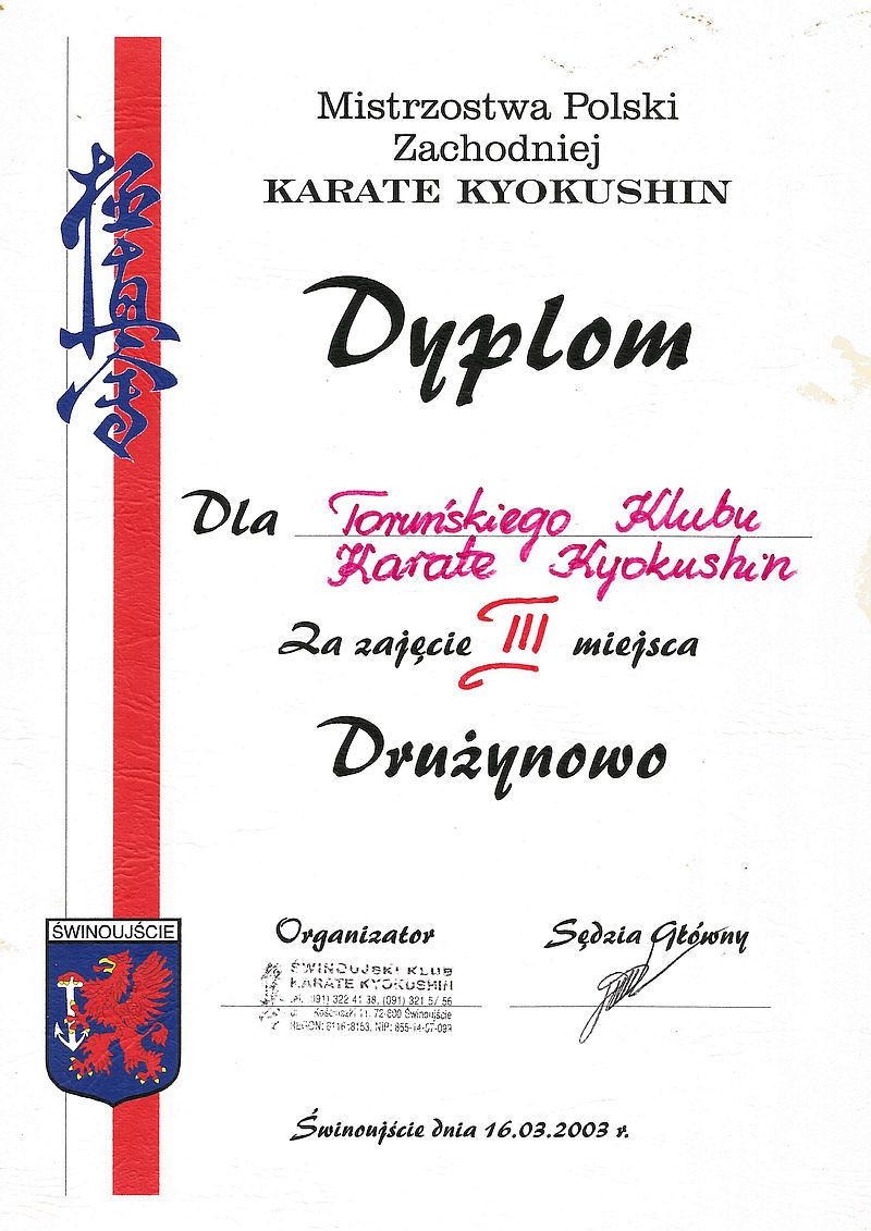W dniu 15 marca 2003r. w Świnoujściu odbyły się Mistrzostwa Makroregionu Zachodniego Karate Kyokushin zorganizowane przez Świnoujski Klub Karate Kyokushin kierowany przez sensei Dariusza Bielskiego i Pawła Sujkę. Zawody odbyły się w Hali Widowiskowo Sportowej Gimnazjum Publicznego nr 1. W mistrzostwach udział wzięło 50 zawodników z 14 klubów północno-zachodniej polski. Wśród nich również nasza reprezentacja.