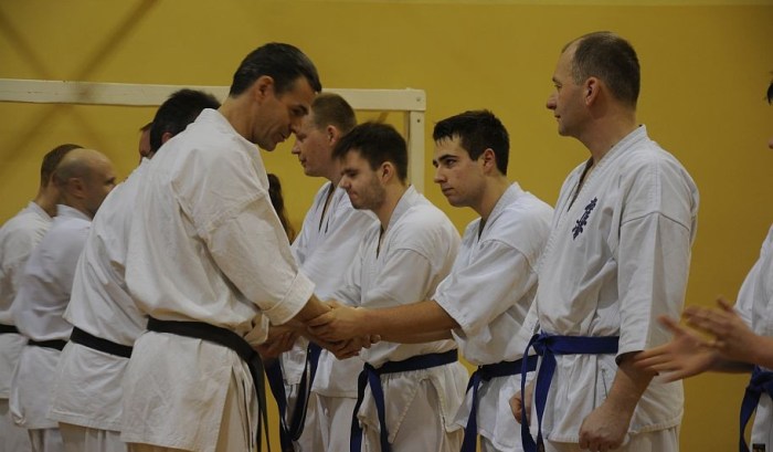 W sobotę 18 stycznia odbył się egzamin na kolejne stopnie szkoleniowe w kyokushin karate. Egzamin odbył się w dwóch turach osobno dla juniorów i seniorów. W drugiej turze wzięli również udział zdający z klubów z regionu. W części technicznej testu zdający prezentowali techniki w miejscu i poruszając się w pozycjach. Zdający na 8 kyu i wyżej wykonywali kata i przechodzili test walki. Najtrudniejszy moment egzaminu to przystąpienie do kumite seniorów. Minimalna ilość ochraniaczy powoduje, że do tej próby trzeba szczególnie się przygotować… Podczas tego egzaminu na 1 kyu zdał Bogdan Sojka, który znakomicie zaprezentował swoje umiejętności – szczególne gratulacje OSU!!!