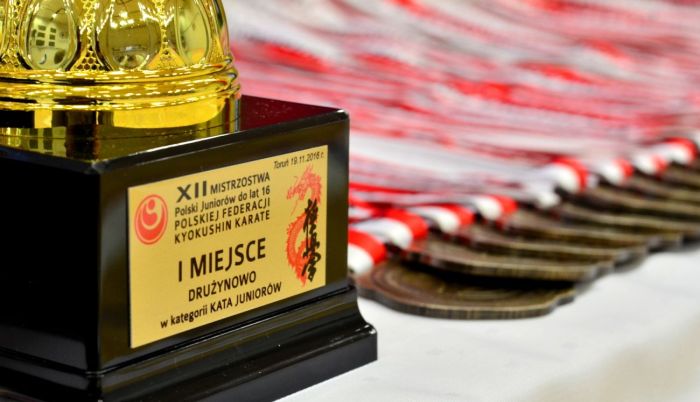 Toruński Klub Karate Kyokushin był organizatorem Mistrzostw Polski Juniorów do lat 16 Polskiej Federacji Kyokushin Karate 19.11.2016. W mistrzostwach wzięło udział 209 zawodników z 36 klubów zrzeszonych w PFKK i PFKS reprezentujących organizację Shinkyokushinkai. Zawody rozegrano w 2 konkurencjach: kata i kumite z podziałem na trzy kategorie wiekowe i dodatkowo w kumite na kategorie wagowe. Wśród startujących była nasza 11 – osobowa drużyna. W podsumowaniu drużynowym nasz klub zdobył puchar Najlepszej Drużyny w Kata!!!
