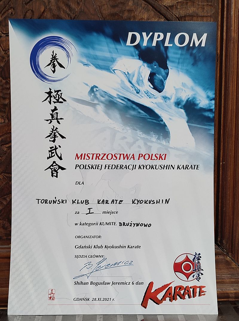 W niedzielę 28 listopada 2021 w Gdańsku zostały rozegrane Mistrzostwa Polski Kumite Polskiej Federacji Kyokushin Karate. Zawody zorganizował Gdański Klub Kyokushin Karate kierowany przez shihan Bogusława Jeremicza. W turnieju wzięło udział 114 zawodników z 24 klubów. Mistrzostwa rozegrano w konkurencjach juniorów i seniorów z podziałem na kategorie wagowe. Nasz klub reprezentowało 10 zawodników, którzy swoją postawą i wynikami sprawili, że w podsumowaniu drużynowym Toruński Klub Karate Kyokushin zajął I miejsce!!!…
