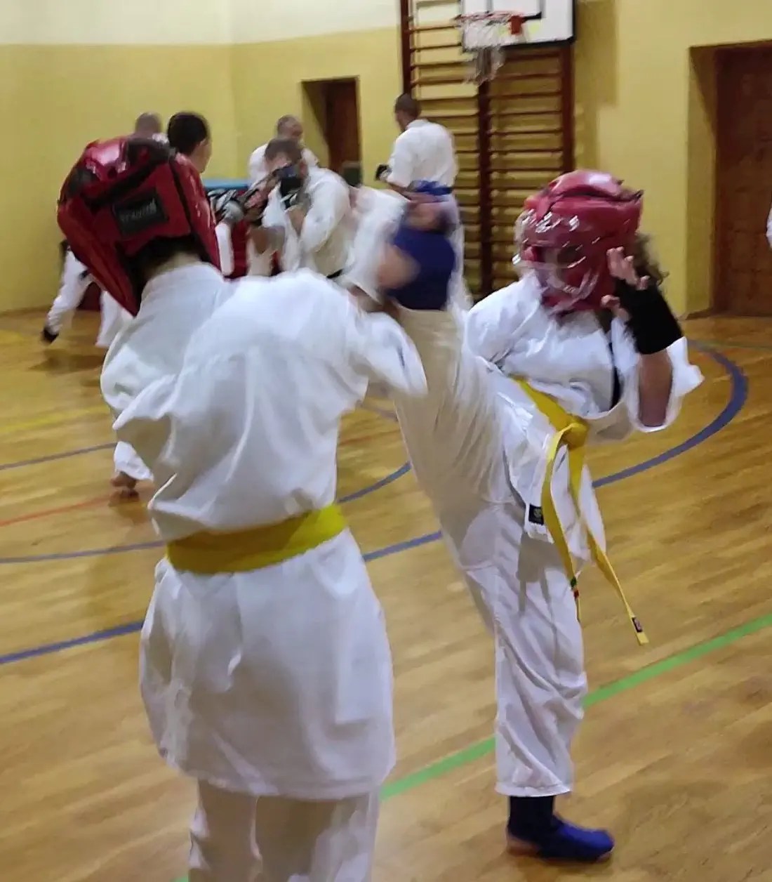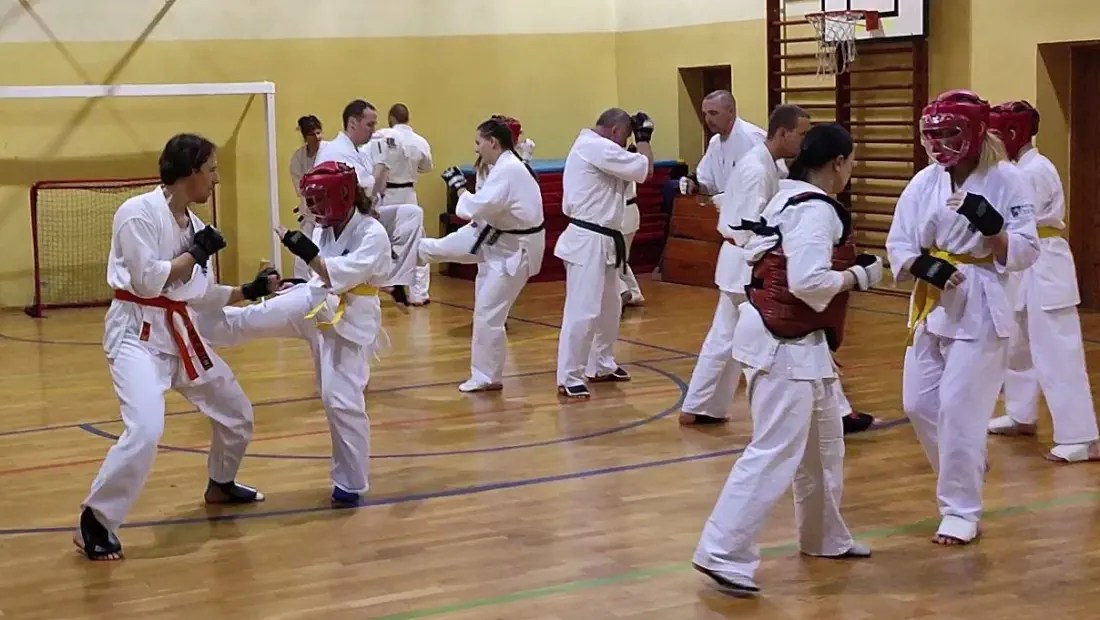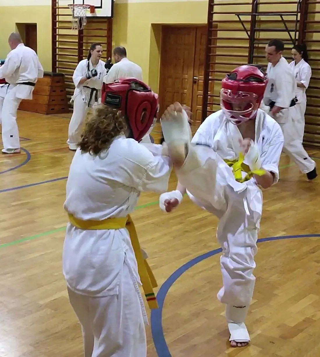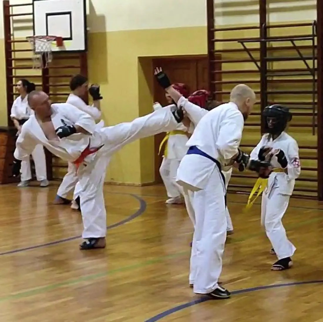 W drugiej grupie więcej uwagi poświęcono na poruszanie się w pozycjach klasycznych i pozycji walki z technikami. W ocenie obserwujących instruktorów ta grupa wypadła bardzo dobrze. Widać było skupienie i dynamiczne wykonanie technik. Dodatkowo zdający na niebieskie i żółte pasy wykonali podstawowe kata i przeszli test kumite.