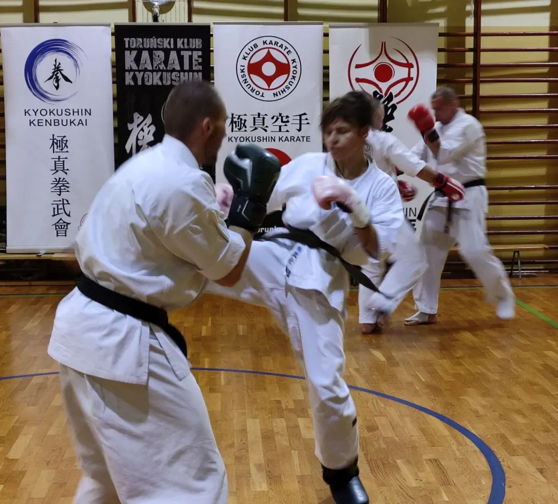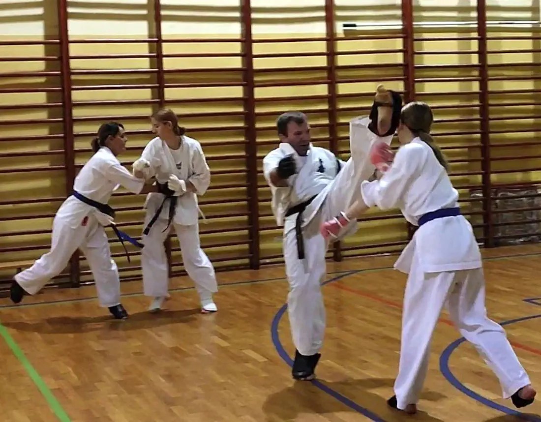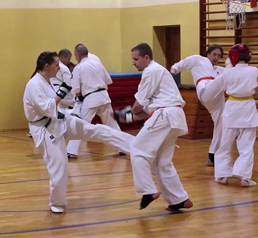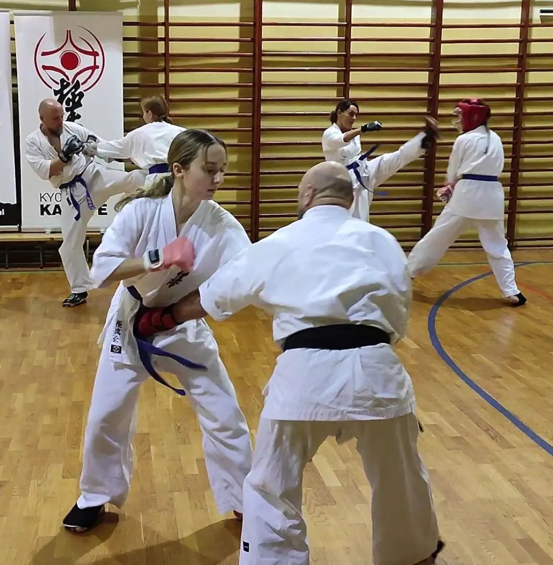 W drugiej grupie więcej uwagi poświęcono na poruszanie się w pozycjach klasycznych i pozycji walki z technikami. W ocenie obserwujących instruktorów ta grupa wypadła bardzo dobrze. Widać było skupienie i dynamiczne wykonanie technik. Dodatkowo zdający na niebieskie i żółte pasy wykonali podstawowe kata i przeszli test kumite.