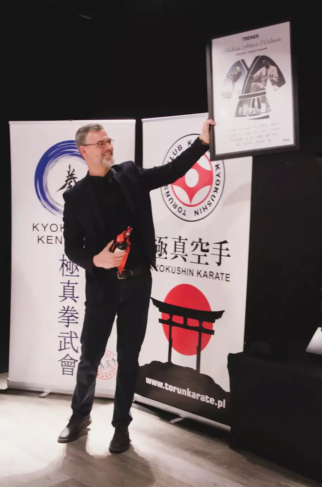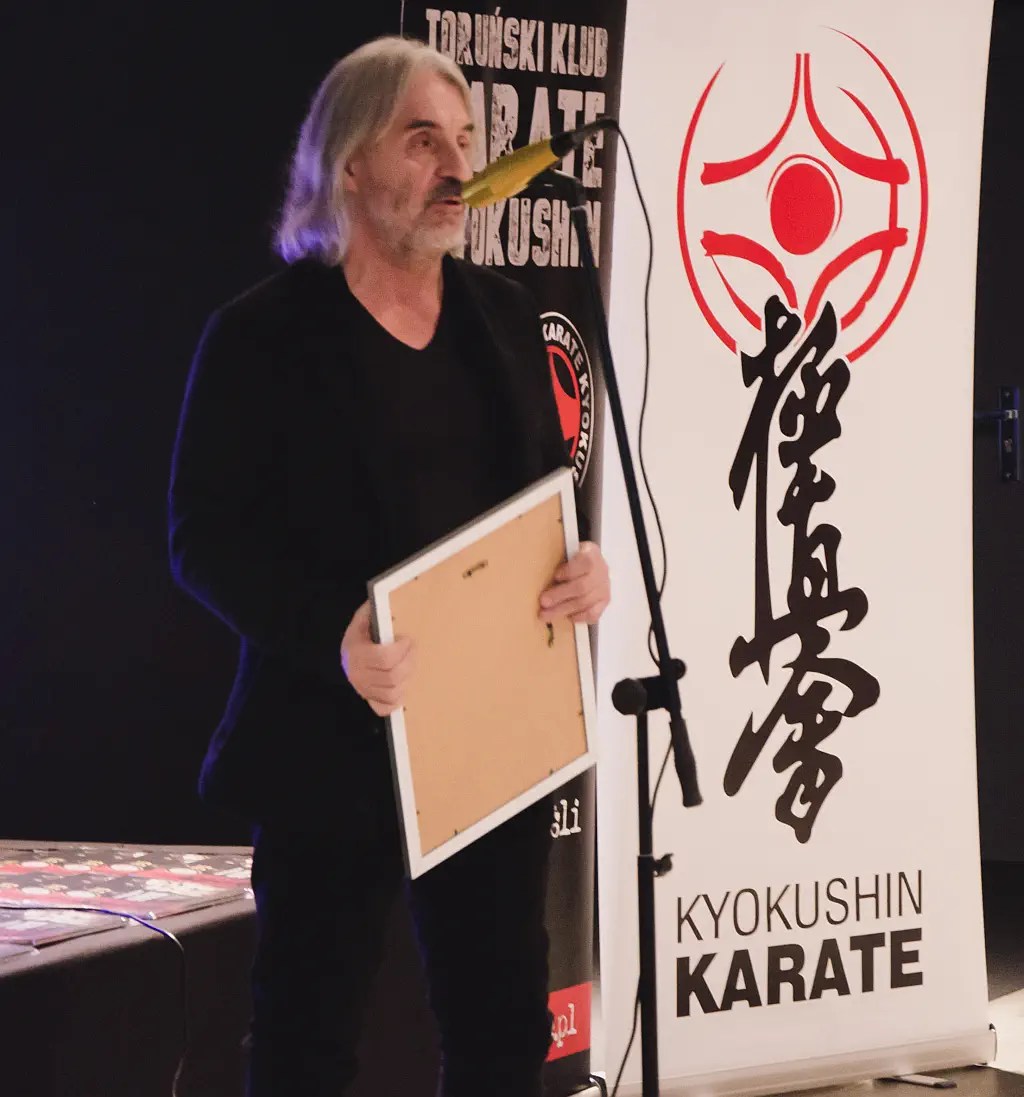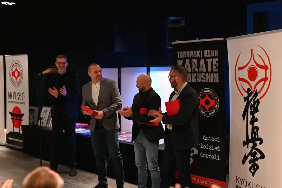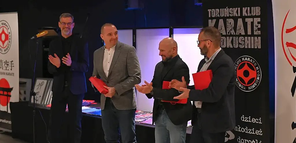 35 lat. Szmat czasu. Tyle się może wydarzyć, zmienić. Na klubowych urodzinach nikt nie podjął wyzwania, by policzyć ile osób przewinęło się przez klub w tym czasie. Z różnych względów byłoby to niemożliwe. Jedno jest pewne, należałoby liczyć nie w setkach, ale w tysiącach. Toruński Klub Karate Kyokushinkai powstał w 1987 roku, z inicjatywy pierwszego jego prezesa i instruktora – Ryszarda Urbańskiego, choć już na początku lat 80-tych ćwiczono w sekcjach TKKF. Należy dodać, że koniec lat 80-tych i początek 90-tych ubiegłego wieku, to był moment największego boomu, jeśli chodzi o uprawianie wschodnich sztuk walki. Coroczne zapisy gromadziły setki ludzi, przyciągniętych wizją dotknięcia czegoś niespotykanego, oryginalnego i – nie ma co ukrywać – orientalnego. Znakomita większość porzucała tę drogę stosunkowo wcześnie, ale wielu wytrwało przez lata, czasami od początku. W naszym klubie są trzy takie osoby – Piotr Binkowski, Sławomir Kłosiński i Tomasz Wrzesień. I to właśnie oni podczas rocznicowej uroczystości otrzymali od shihan Artura Wilento, obecnego prezesa TKKK podziękowania za swój wkład we współtworzenie klubu, wraz z rocznicowym upominkiem. Bo, co tu dużo ukrywać – bez całej tej czwórki, a wliczam w to i obecnego szefa – klubu by nie było. To znaczy – może by i był, ale nie byłby tym, czym jest – grupą przyjaciół, połączonych tą samą pasją