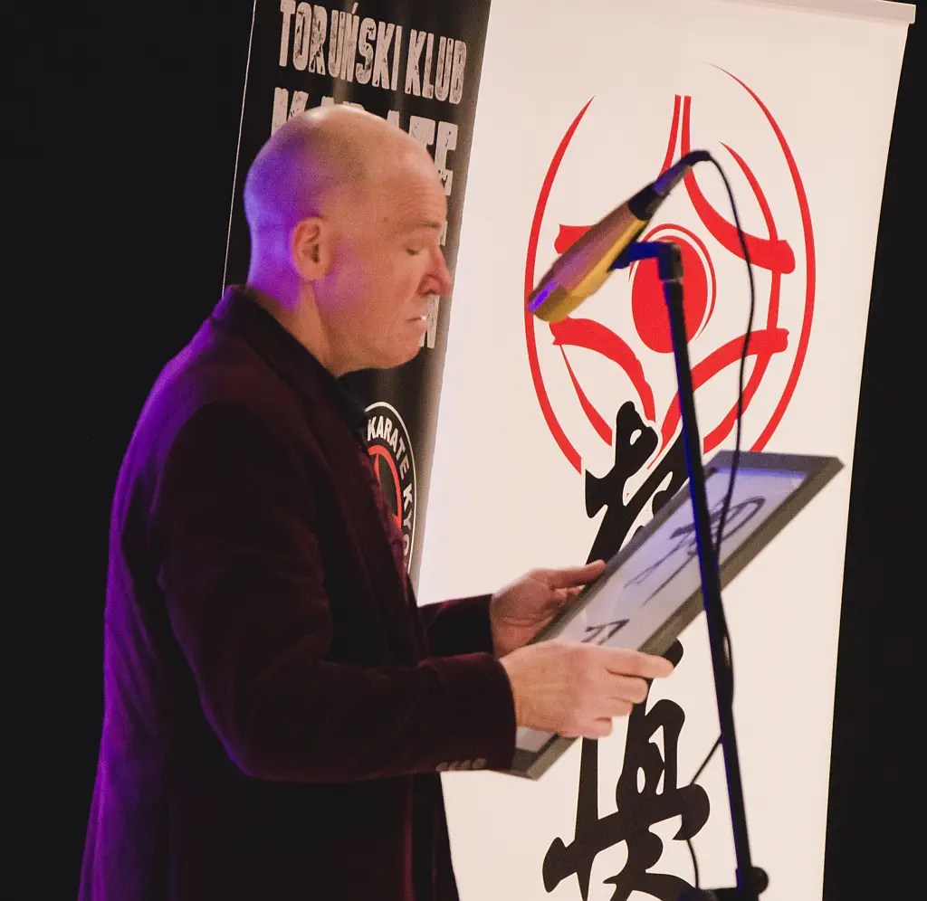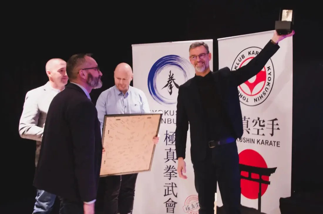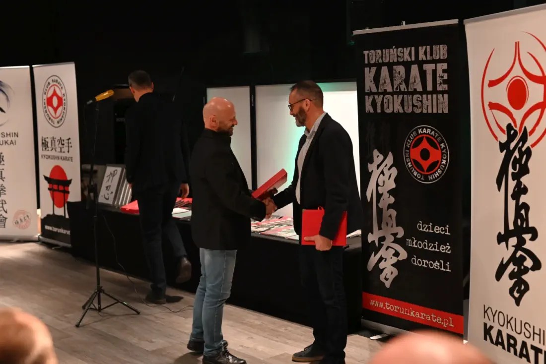 35 lat. Szmat czasu. Tyle się może wydarzyć, zmienić. Na klubowych urodzinach nikt nie podjął wyzwania, by policzyć ile osób przewinęło się przez klub w tym czasie. Z różnych względów byłoby to niemożliwe. Jedno jest pewne, należałoby liczyć nie w setkach, ale w tysiącach. Toruński Klub Karate Kyokushinkai powstał w 1987 roku, z inicjatywy pierwszego jego prezesa i instruktora – Ryszarda Urbańskiego, choć już na początku lat 80-tych ćwiczono w sekcjach TKKF. Należy dodać, że koniec lat 80-tych i początek 90-tych ubiegłego wieku, to był moment największego boomu, jeśli chodzi o uprawianie wschodnich sztuk walki. Coroczne zapisy gromadziły setki ludzi, przyciągniętych wizją dotknięcia czegoś niespotykanego, oryginalnego i – nie ma co ukrywać – orientalnego. Znakomita większość porzucała tę drogę stosunkowo wcześnie, ale wielu wytrwało przez lata, czasami od początku. W naszym klubie są trzy takie osoby – Piotr Binkowski, Sławomir Kłosiński i Tomasz Wrzesień. I to właśnie oni podczas rocznicowej uroczystości otrzymali od shihan Artura Wilento, obecnego prezesa TKKK podziękowania za swój wkład we współtworzenie klubu, wraz z rocznicowym upominkiem. Bo, co tu dużo ukrywać – bez całej tej czwórki, a wliczam w to i obecnego szefa – klubu by nie było. To znaczy – może by i był, ale nie byłby tym, czym jest – grupą przyjaciół, połączonych tą samą pasją