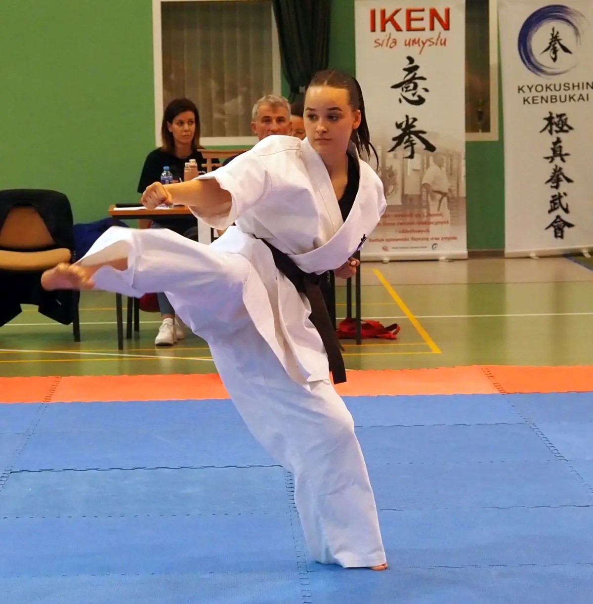 Zacznijmy jednak od początku. Po otwarciu zawodów rozpoczęła się rywalizacja w kata z podziałem na grupy wiekowe. W połowie grup wiekowych zgodnie z regulaminem rozegrano trzy rundy klasyfikacyjne. Nasz klub w kata reprezentowała Zuzanna Binkowska w kategorii open kobiet. Po rundzie eliminacyjnej była w czołówce startujących. W kolejnych rundach otrzymała najwyższą ilość punktów. W rezultacie zdobyła tytuł Mistrzyni Polski w Kata Kobiet PFKK!!!