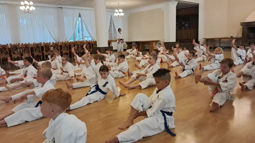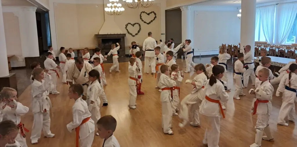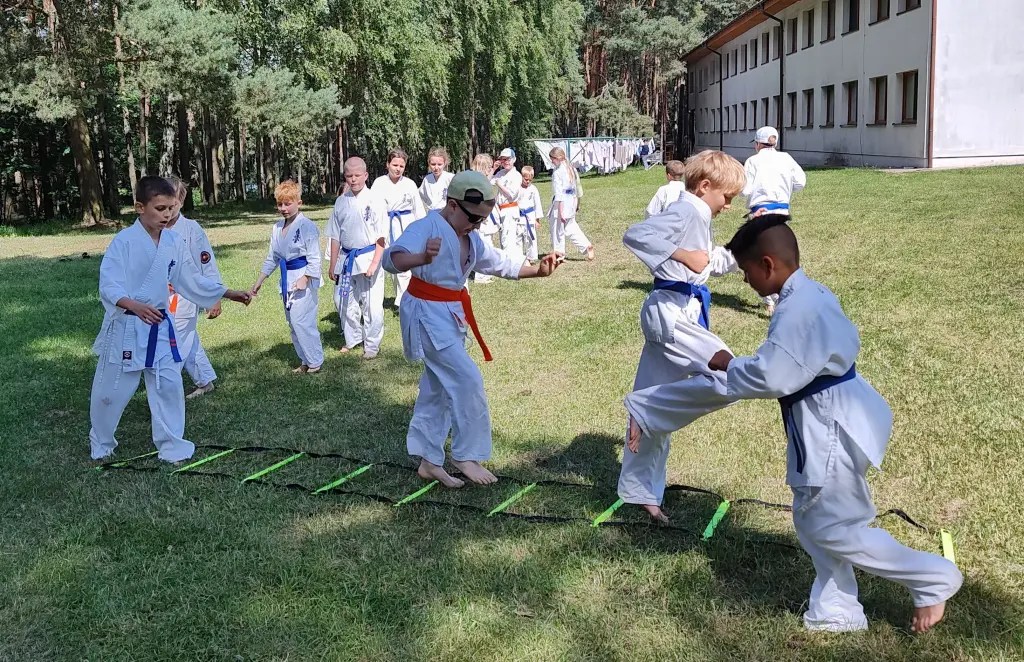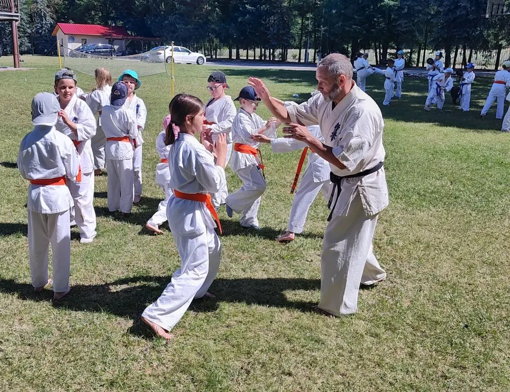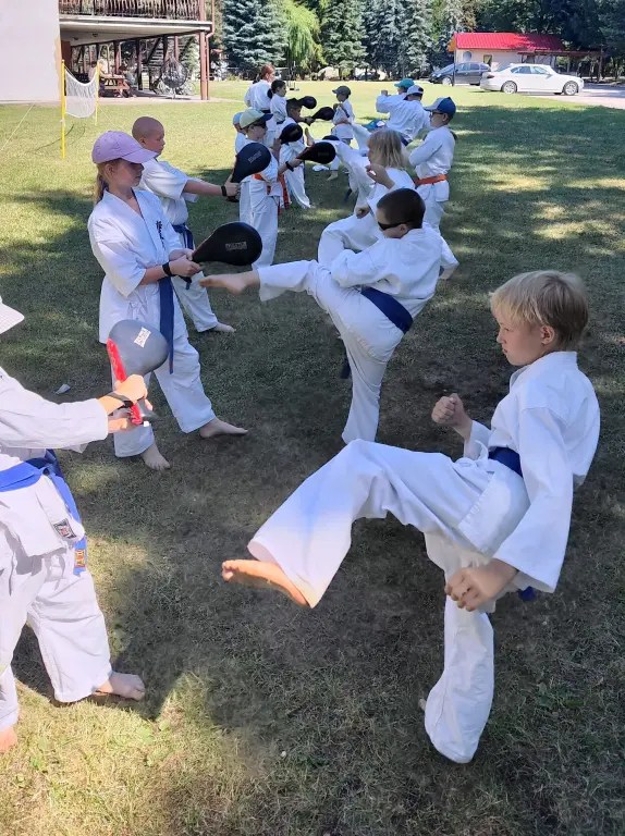 Treningowo pracowały 3 grupy podzielone według wieku i umiejętności, co pozwoliło na dobranie odpowiednich ćwiczeń do każdej z nich. Głównym celem treningów była precyzja wykonania zadań, co miało kluczowe znaczenie dla dalszego rozwoju umiejętności. Mieliśmy na to dużo czasu, a treningi były wszechstronne i obejmowały różnorodne zadania. Codziennie dzień rozpoczynaliśmy porannym rozruchem, który był nie tylko formą aktywności fizycznej, ale także sposobem na zbudowanie zgranej grupy. Dalej, w trakcie dnia, przeprowadzaliśmy treningi karate głównie na świeżym powietrzu na terenie ośrodka. Codziennie również każda grupa prezentowała swoje umiejętności kata podczas wieczornych pokazów, co stanowiło doskonałą okazję do nauki od siebie nawzajem oraz obserwację postępów, które każdy z ćwiczący osiągał w trakcie sesji treningowych.
