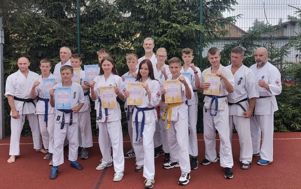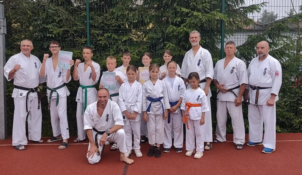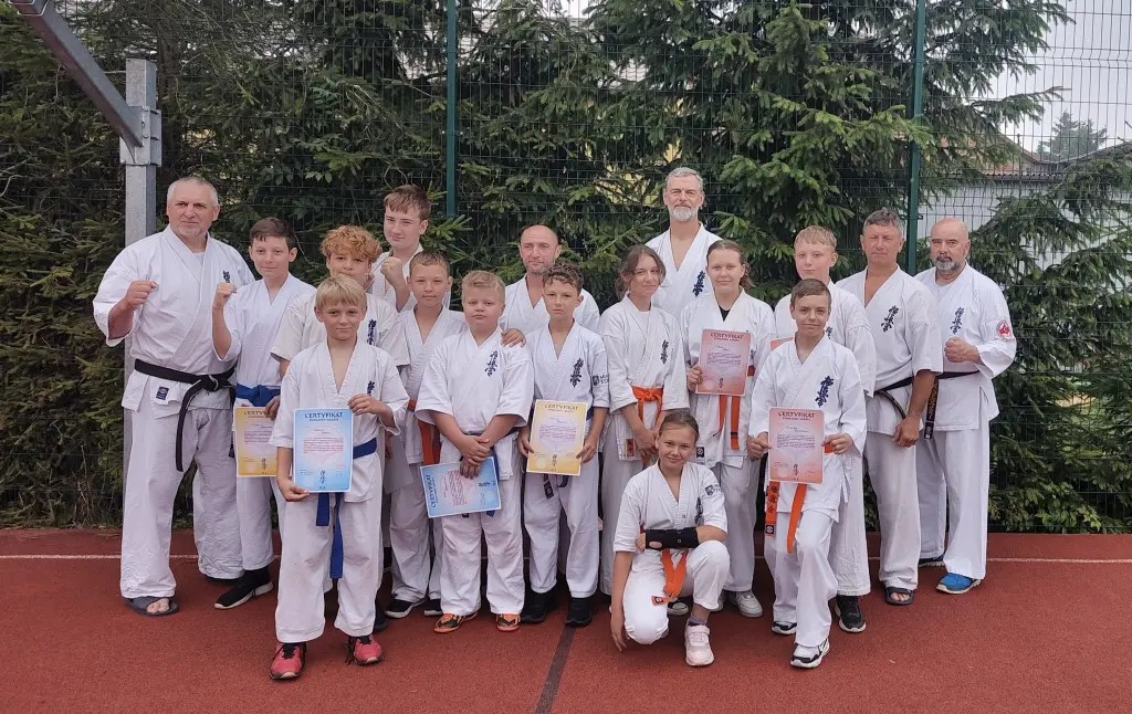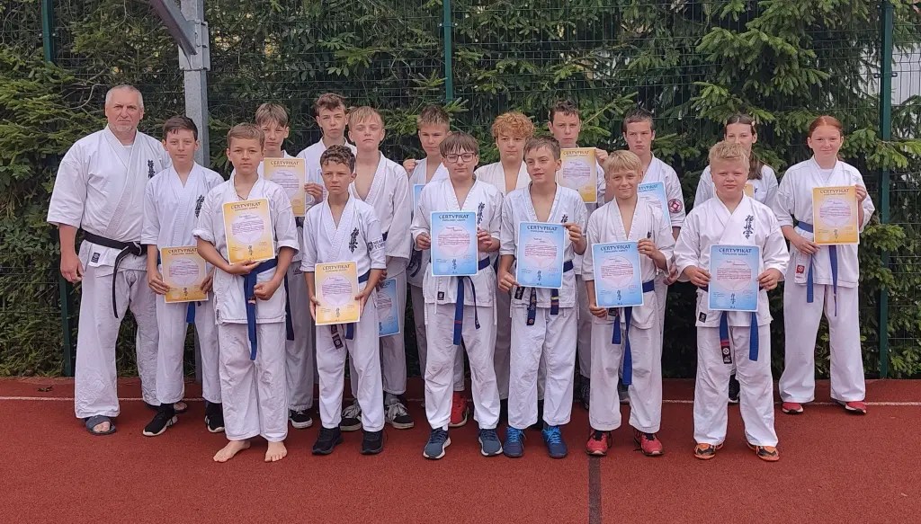 Jak wcześniej pisaliśmy podsumowaniem pracy treningowej był egzamin na stopnie szkoleniowe kyu. Egzamin przebiegał w dwóch częściach. Pierwsza część to technika, którą zdający prezentowali w miejscu, w ruchu oraz w parach. Każdy zdający na koniec tej części prezentował umiejętność opanowania kata. Osobnym testem było kumite. Zdający podzieleni zostali na dwie grupy wiekowe. W każdej z nich oceniana była postawa i umiejętność prowadzenia walki.